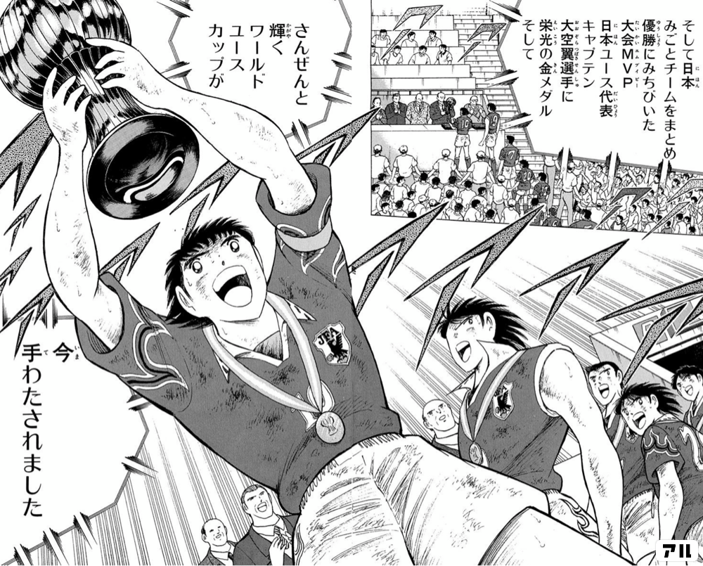 そして日本 みごとチームをまとめ 優勝にみちびいた 大会mvp 日本ユース代表キャプテン大空翼選手に 栄光の金メダル そしてさんぜんと輝くワールドユースカップが 今手わたされました キャプテン翼 ワールドユース編 アル