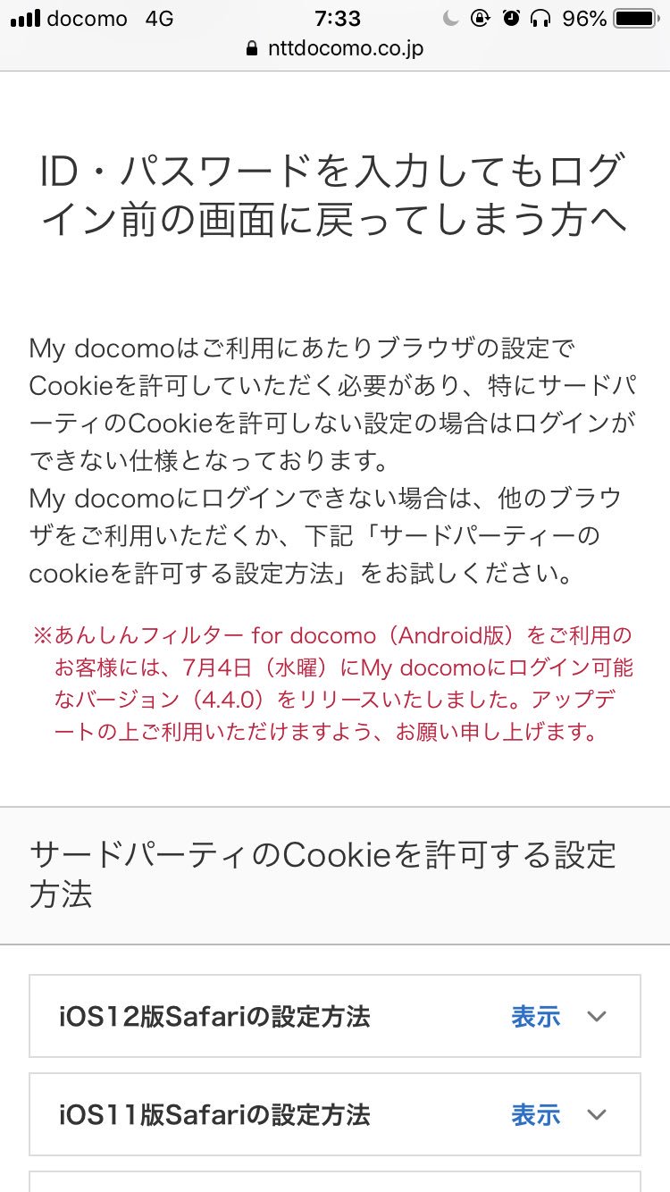 あどてっぷ On Twitter My Docomo Idとpassを何回入力してもログイン出来ないと思ってたらこういうことだったのか My Docomoはご利用にあたりブラウザの設定でcookieを許可していただく必要があり 特にサードパーティのcookieを許可しない設定の場合はログインが